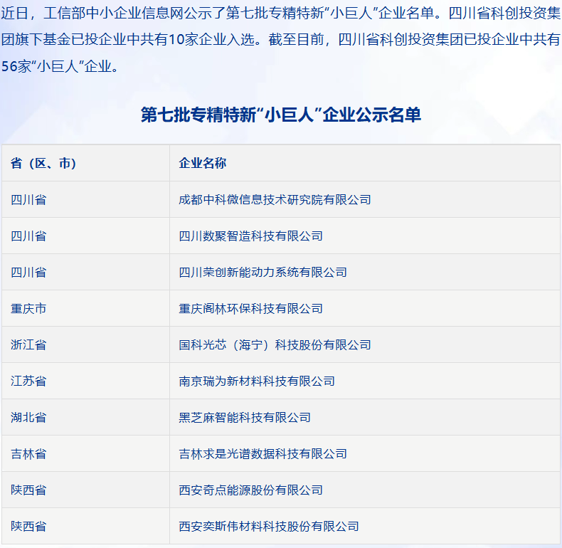 已投企业动态 | 四川省科创投资集团再添10家国家级专精特新“小巨人”!