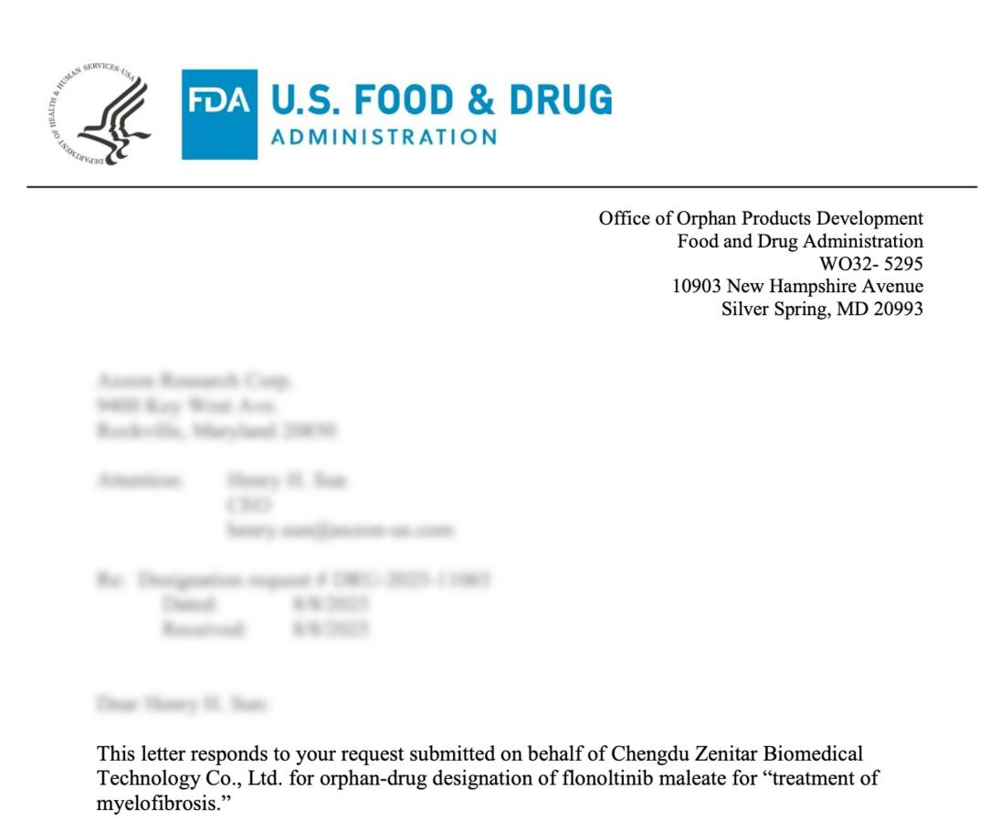 近日,四川省科创投资集团已投企业——成都赜灵生物医药科技有限公司(简称“赜灵生物”)迎来重要里程碑。其自主研发的核心产品马来酸氟诺替尼(Flonoltinib Maleate, FM) 用于治疗骨髓纤维化(Myelofibrosis, MF)的适应症,正式获得美国食品药品监督管理局(FDA)授予的孤儿药资格认定(Orphan Drug Designation, ODD)。此次认定,不仅体现了监管机构对该适应症显著未满足临床需求的认可,也从监管层面体现了对FM在该领域潜在临床与商业价值的积极评价,将进一步支持公司持续推进FM的全球开发进程,有助于FM在后续临床发及商业化阶段享有包括市场独占期、监管沟通支持等一系列政策优势。