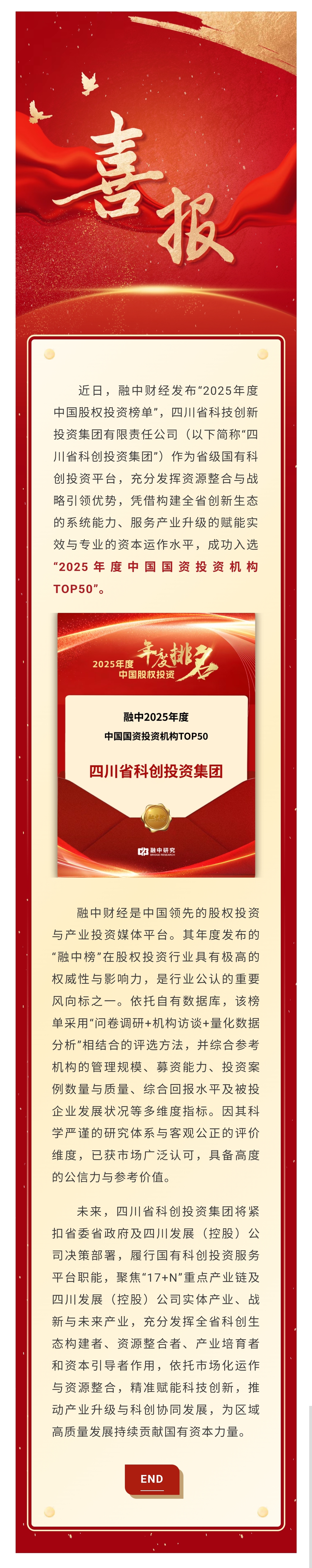 荣誉 | 四川省科创投资集团荣获融中财经“2025年度中国国资投资机构TOP50”
