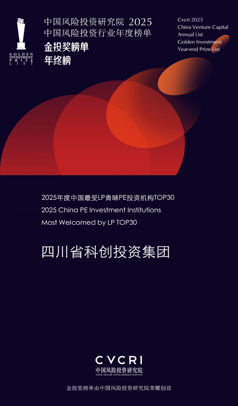 近日,中国风险投资研究院(CVCRI)正式揭晓“2025中国风险投资行业年度榜单·金投奖榜单·年终榜”。四川省科创投资集团凭借专业的资产配置能力、持续的价值创造与稳健的投资回报,成功入选“2025年度中国最受LP青睐PE投资机构TOP30”。